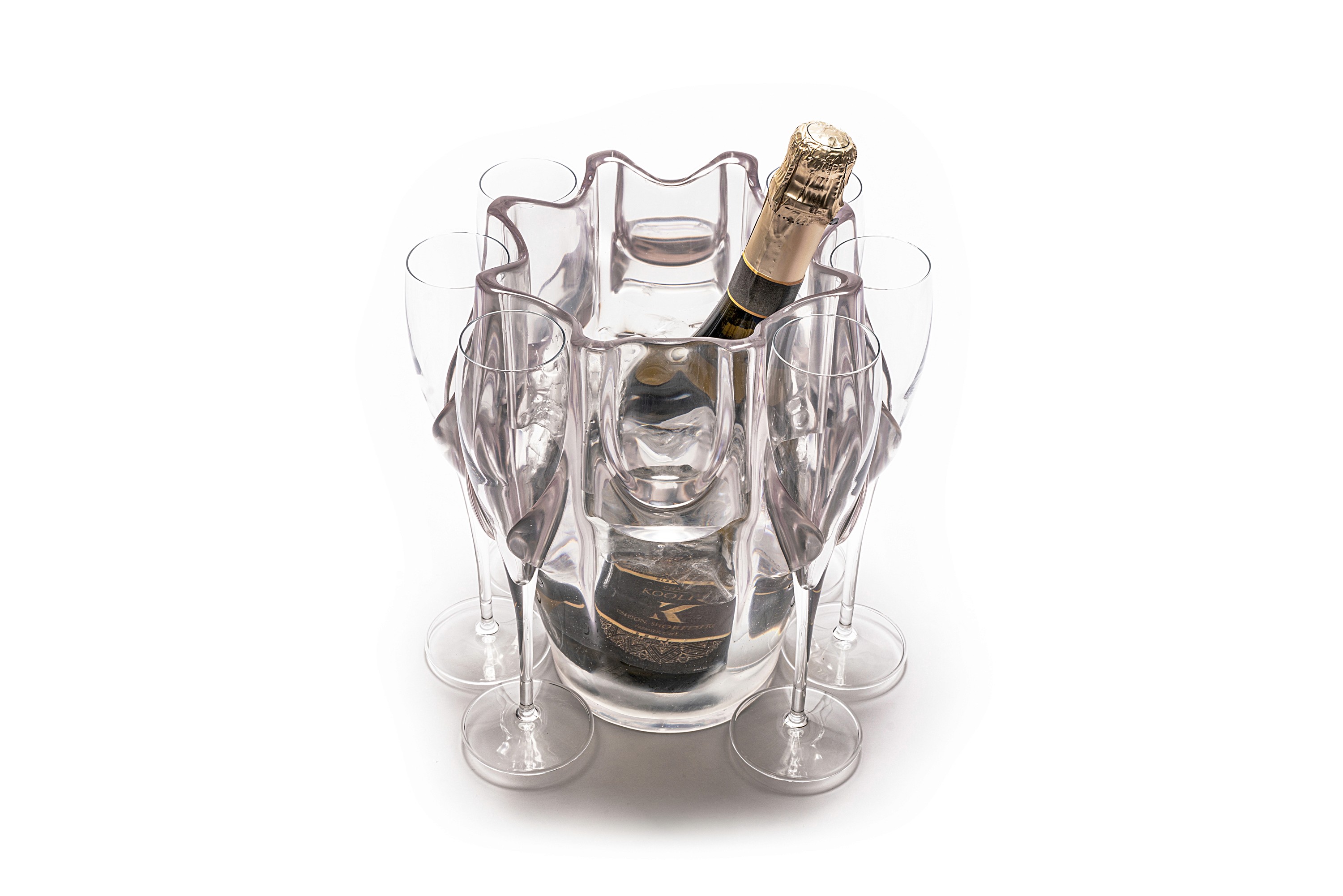 Description: This champagne cooler features 6 unique integrated glass holders. you can perfectly chill a bottle of champagne for serving almost anywhere. Ideal for BBQs, outdoor events and parties, alfresco dining has never been so easy and relaxing.